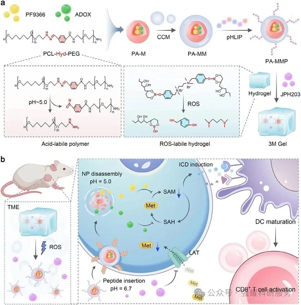 (1)实验利用肿瘤细胞靶向纳米颗粒(NPs)对小分子抑制剂PF9366和腺苷二醛进行封装,以实现细胞内甲硫氨酸代谢的级联阻断。研究者进一步将该NPs与细胞外甲硫氨酸摄取抑制剂JPH203共负载到对活性氧敏感的水凝胶中,以组装制备可多重调节甲硫氨酸的水凝胶(3M凝胶)。