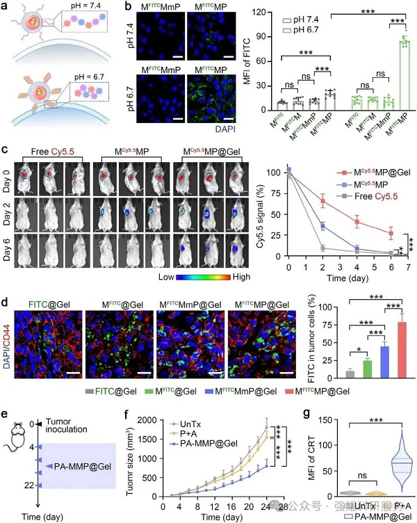 (1)靶向性与安全性:PA-MMPs 在酸性 TME(pH 6.7)中肿瘤细胞结合效率较中性环境提升 2.3 倍,对正常免疫细胞(BMDMs、DCs、CD8⁺T)无毒性。