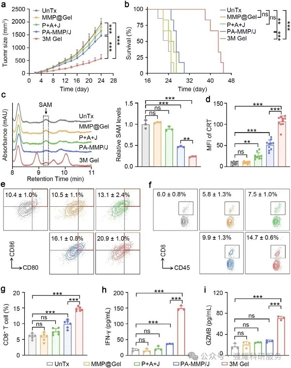 (2)在小鼠三阴性乳腺癌(TNBC)、肝细胞癌和结直肠癌等模型中,原位形成的3M凝胶可在限制S-腺苷甲硫氨酸生成和组蛋白甲基化、刺激肿瘤细胞免疫原性细胞死亡等方面表现出优越的疗效,从而能够引发有效的先天和适应性免疫反应,以抑制肿瘤进展。此外,3M凝胶也能够通过重塑肿瘤微环境克服TNBC对免疫检查点阻断的抵抗。