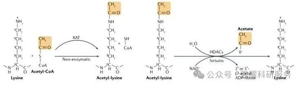Nɛ-乙酰化又称赖氨酸乙酰化,是指将乙酰基从乙酰辅酶A(Ac-CoA)转移到蛋白质中赖氨酸侧链ɛ位的伯胺上。这一可逆过程中和了赖氨酸侧链ε位的正电荷。