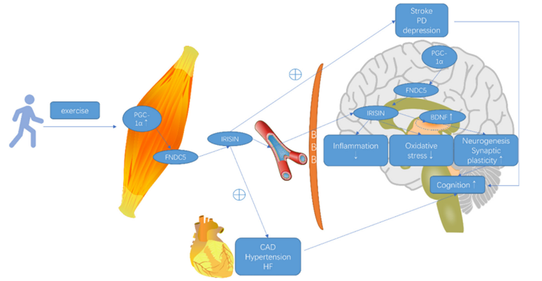 FNDC5/鸢尾素在运动和大脑中的作用图,doi: 10.1016/j.pcad.2019.02.007