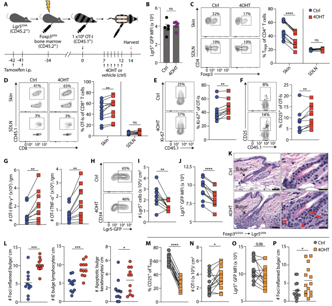为了深入了解Tregs在皮肤中的免疫调节机制,该研究团队采用了一项创新的基因编辑技术。他们将表达一个能够受到孕酮类激素(如4-羟基孕酮,4OHT)诱导的Cre酶的小鼠与携带一个Rosa26–lox-stop-lox (LSL)–tdTomato基因的小鼠进行杂交。在这一系统中,当给予小鼠4-羟基孕酮时,它在体内被代谢成活性形式,激活Cre酶。Cre酶的活性可导致Rosa26位点上的阻塞基因(lox-stop-lox)被切除,从而启动tdTomato基因的表达。tdTomato是一种红色荧光蛋白,可用于标记表达了Cre的细胞,即Tregs。通过这种方式,研究人员能够实现对皮肤中Tregs的局部、特异性标记。