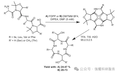 该方法中的环四肽需含有丝氨酸、苏氨酸或半胱氨酸,它们的侧链在酸催化下通过环缩合反应生成伪脯氨酸残基的噁唑烷和噻唑烷。此外,伪脯氨酸可能难以酰化,需预先制备二肽单元。