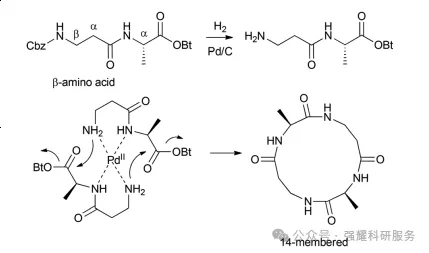 研究人员使用镍(Ni(II))成功形成了环状四肽(12元环),这是因为镍离子具有理想的离子半径,以促进四肽的环化反应。此外,还有利用以钯催化的一锅法脱保护/环化二聚方法合成含β-氨基酸的C2对称环状四肽。