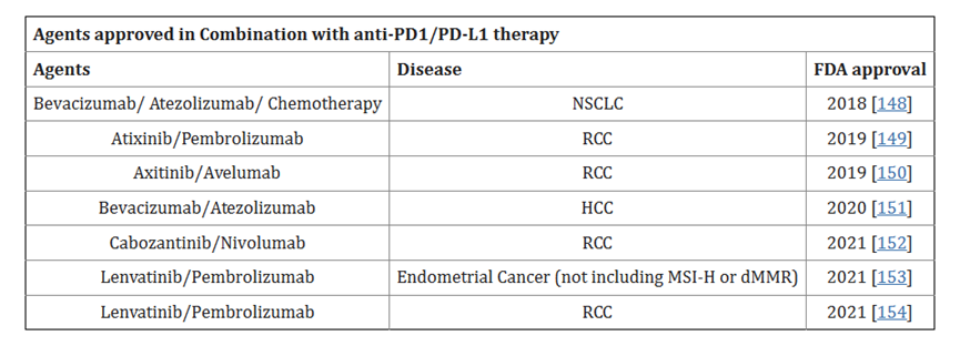 CD8 T细胞上VEGFR2信号的激活,增加了免疫检查点抑制剂靶向的分子的表达。免疫检查点抑制剂最常见的靶点是:1)T细胞上的程序性细胞死亡蛋白1(PD-1);2)其配体PD-L1;3)细胞毒性T淋巴细胞抗原4(CTLA-4)。免疫检查点抑制剂与抗VEGF/VEGFR的组合使用显示出协同作用,并且一些药物已经获得FDA批准。如阿替唑单抗(抗PD-L1)和贝伐单抗联合CT治疗非小细胞肺癌;阿替利珠单抗和贝伐珠单抗联合治疗不可切除的肝细胞癌等。