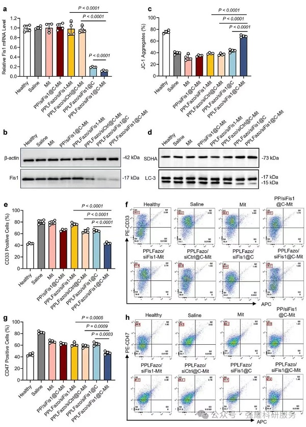 (2)用PPLFazo/siFis 1处理的C1498细胞中的线粒体膜电位降低,导致线粒体功能紊乱和干性标志物(如CD34+、CD38-)表达减少;线粒体自噬标志物LC3-II/I 比率下降,Western进一步证实Fis 1沉默导致线粒体自噬的下调。