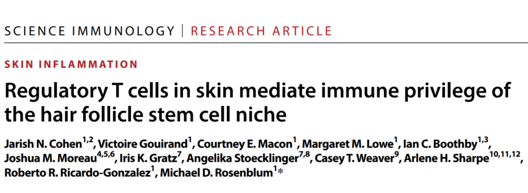 近期,由加州大学等多家院校联合完成的一项关于干细胞在自身免疫性脱发中的研究成果闪亮登场,在科学界掀起一场医学革命。相关研究结果于2024年1月5日发表在Science Immunology杂志,论文题目为“Regulatory T cells in skin mediate immune privilege of the hair follicle stem cell niche”。这项研究不仅揭开了免疫性脱发的神秘面纱,更为治疗这一常见问题提供了前所未有的新途径。