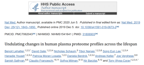 斯坦福大学相关研究人员在Nature medicine杂志发表了文章[1],该研究对各个年龄段人类血浆进行了蛋白质组学分析,测定了4263名18-95岁的人群中共2925个血浆蛋白,探讨了人类血浆蛋白质组谱在整个生命周期中的波动变化,最终发现人类血液中蛋白质的水平在三个年龄点的变化最为显著:34岁、60岁和78岁。
