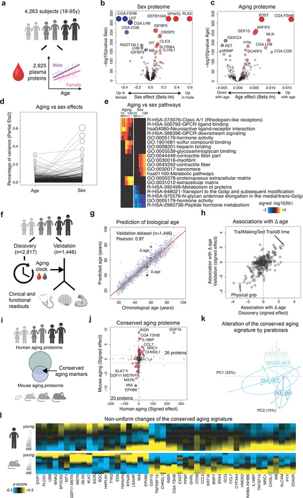 作者分析了4263名年龄在18-95岁的健康个体的血浆,采用SomaScan适配体技术生成了人类寿命的蛋白质组数据集。因女性平均寿命比男性长,所以作者评估了性别和衰老蛋白质组的关联,发现与年龄密切相关的蛋白质在不同性别之间也存在差异。