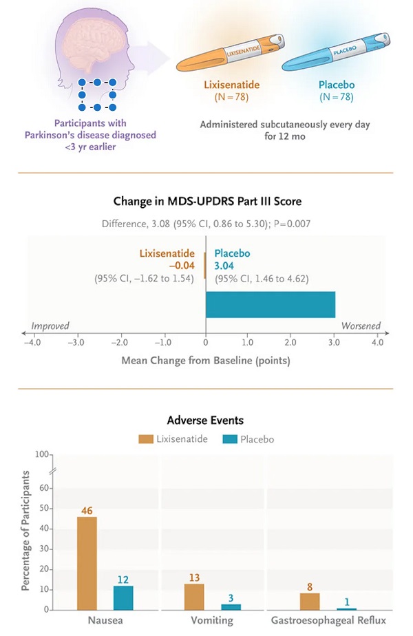 在这篇新论文中,研究团队在法国招募了156名早期帕金森病患者,然后按1:1随机分配接受Lixisenatide(由赛诺菲开发)或安慰剂治疗。两组患者基线时的MDS-UPDRS第Ⅲ部分评分均为约15分。