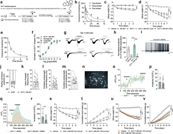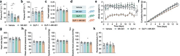 小鼠实验中,研究者分别选择给饮食诱导肥胖的小鼠注射GLP-1受体激动剂、MK-801或者GLP-1–MK-801。