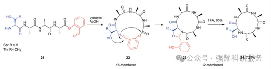 分子内Ser/Thr连接法要求N-末端具备Ser或Thr残基,同时在C-末端连接水杨醛(SAL)酯。先反应形成头尾相连的16元亚胺中间体。随后,通过分子内的O-to-N酰基转移形成N,O-苄腙缩醛中间体。最后,在酸催化条件下去除缩醛基团。