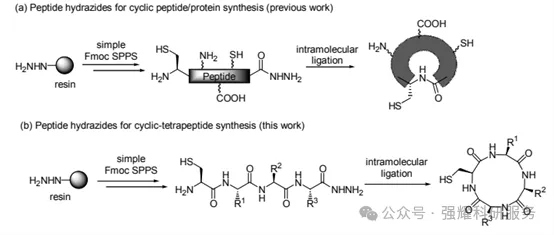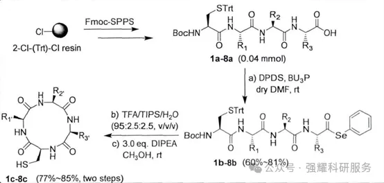 将未保护的线性四肽的C端转化为苯硒酚酯,使其与N端的半胱氨酸发生类似自然化学连接的反应,再通过分子内的N-to-S交换,成功形成了首位相连的环四肽。这种方法未观察到消旋现象,且聚合物的含量相对较低。