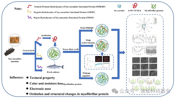 近日,大连民族大学生物技术与生物资源利用重点实验室的李婷婷研究团队发表了一篇关于抗冻肽的文章。旨在探讨从海参肠道蛋白水解物中提取的抗冻LPEFTEEEK在三文鱼肉质中的应用效果及其潜在机制。