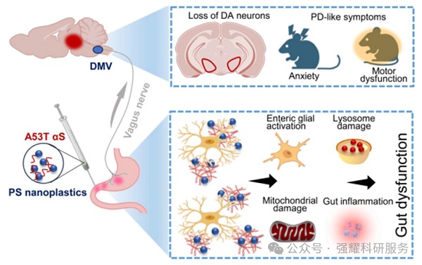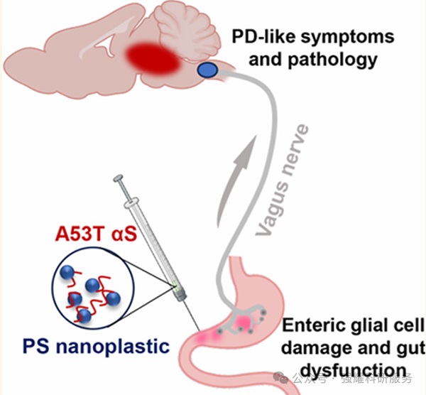 体内实验表明,PS纳米塑料与A53T αS共同作用可以促进从肠道到大脑的传播,导致类似PD的症状,如焦虑和运动功能障碍。