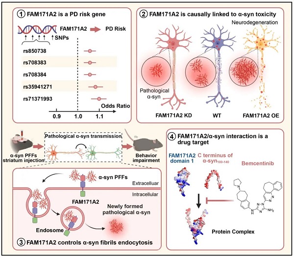 该研究首次发现了帕金森病(PD)的全新治疗靶点——FAM171A2,并利用基于人工智能的蛋白质结构预测和虚拟筛选技术,成功找到了具有潜在治疗作用的小分子化合物。