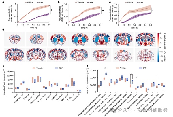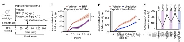 研究者首先BRP对食物摄入的影响,利用小鼠、迷你猪和大鼠,通过注射不同剂量的BRP或其他对照物质(如GLP-1、Exendin-4等),观察其对动物行为、代谢和生理指标的影响。BRP降低小鼠的食物摄入它还影响能量代谢(如RER、VO2、VCO2)、饮水行为和胃排空速度。
