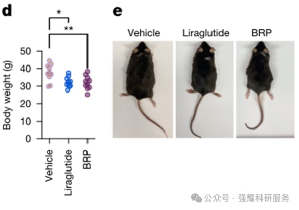 研究人员接着研究BRP对肥胖小鼠的治疗效果。用BRP和作为对照的抗肥胖药物利拉鲁肽(Liraglutide)对肥胖小鼠进行处理,BRP显著降低了小鼠的体重,效果优于对照组。与GLP-1相比,BRP的效果相当或更好,尤其是在降低体重和改善代谢指标方面。