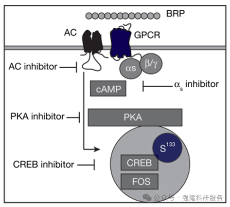 接着,在小鼠神经元Neuro2a细胞系中进行磷酸激酶谱分析,发现BRP的主要作用是诱导CREB在S133位点的磷酸化(pCREBS133)。了确定BRP在体内的作用位置,小鼠接受了载体或BRP的处理,发现BRP 在体内主要作用于大脑,激活了下丘脑中POMC阴性神经元中的CREB-FOS信号通路。
