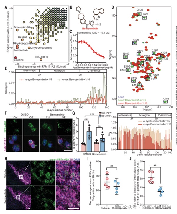 bemcentinib作为一种潜在的治疗药物,展示了抑制α-syn纤维传播的可能性。通过阻断FAM171A2与α-syn纤维的结合,bemcentinib可能成为一种新型的治疗策略,用于减缓或阻止帕金森病的进展。这为未来开发针对α-syn纤维传播的治疗方法提供了重要的理论基础和实验依据。