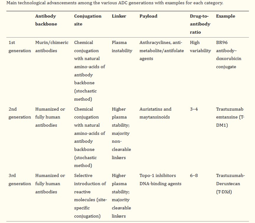 第一代ADC在循环中不稳定,导致药物的全身性损失,且由于有效载荷效力不足和不可预测的全身毒性而显示出狭窄的治疗指数。第二代和第三代ADC获得了更大的治疗指数,这些ADC依靠创新的连接子、更有效的有效载荷和位点特异性偶联来设计具有明确药物抗体比的同质ADC。此外,使用人源化抗体骨架进一步降低了ADC的免疫原性。如下表总结了各代ADC的主要技术进步,并举例说明每个类别。