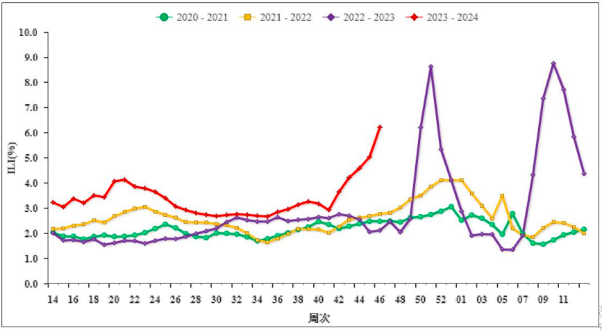 2020-2024 年度北方省份哨点医院报告的流感样病例%