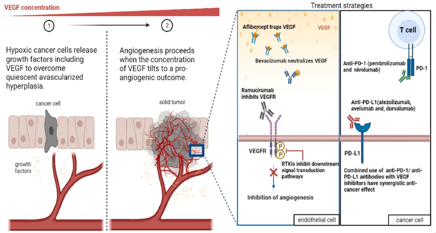 VEGF在肿瘤血管生成中的关键作用,及其在各种类型肿瘤中的高表达,使其成为癌症诱导的血管生成药物治疗中最具吸引力的靶标。因此,阻断VEGF通路抑制血管生成在癌症治疗中引起了人们的极大关注。